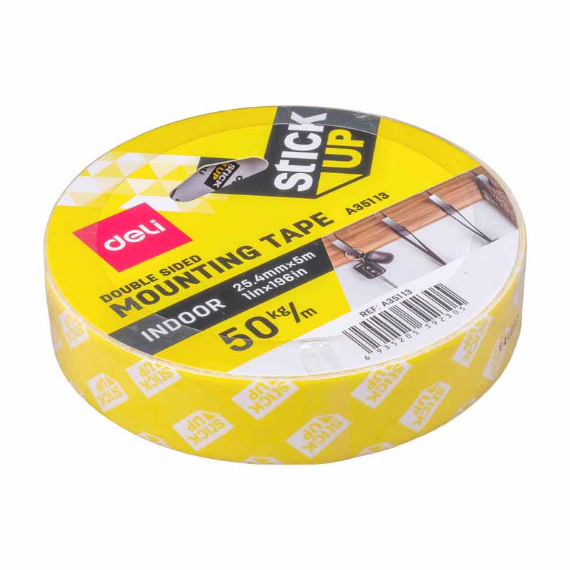 DELI Mounting Tape 1″x5M Large Core is a heavy-duty double-sided adhesive tape perfect for mounting, crafting, and home or office use. Easy to cut, strong, and reliable, it sticks securely to walls, glass, metal, and more. Ideal for DIY projects, décor, and repairs.